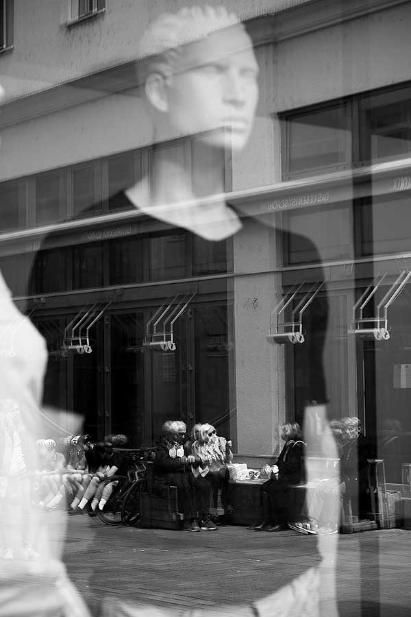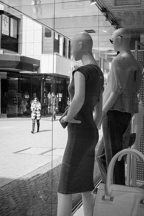 Auf dem Bild sieht man einen Mann, der ein Schaufenster betrachtet, in dem drei Schaufensterpuppen mit Damenbekleidung ausgestellt sind. Hier sind einige Details: