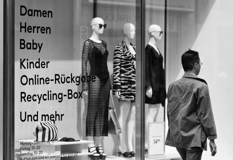 Text im Schaufenster: Es werden Kategorien wie “Damen”, “Herren”, “Baby”, “Kinder” aufgelistet. Es werden Dienstleistungen wie Online-Rückgabe (“Online-Rückgabe”) und Recycling-Box (“Recycling-Box”) erwähnt. Zusätzliche Informationen zu den Öffnungszeiten befinden sich unten im Fenster.